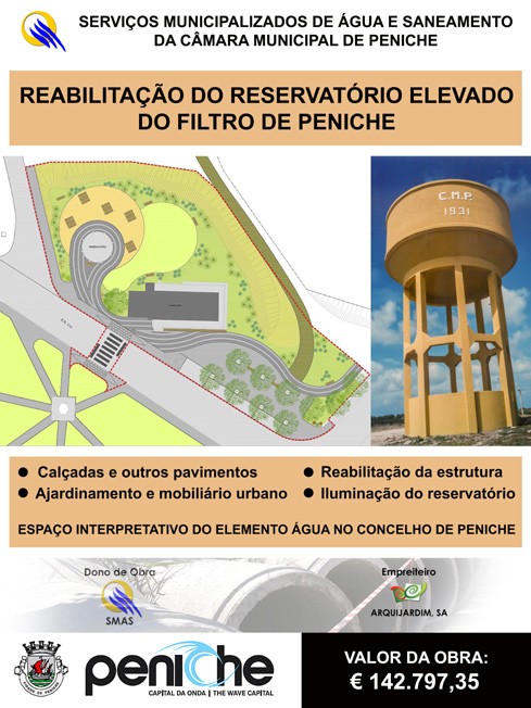 Como já estava programado, iniciaram-se no passado dia 22 os trabalhos da empreitada de reabilitação do Reservatório Elevado do Filtro de Peniche, que pretende tornar esta área num espaço interpretativo do elemento Água no concelho de Peniche.