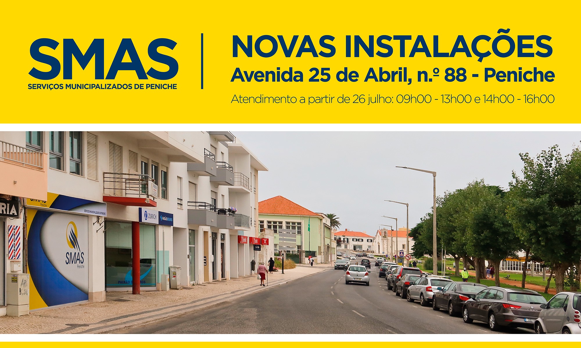 No dia 26 de julho, a secção comercial dos SMAS irá estar instalada e ao serviço na nova sede sita em Avenida 25 de Abril, n.º 88, Peniche, onde os utilizadores se deverão dirigir a partir dessa data para tratar de tudo o que diga respeito aos serviços.